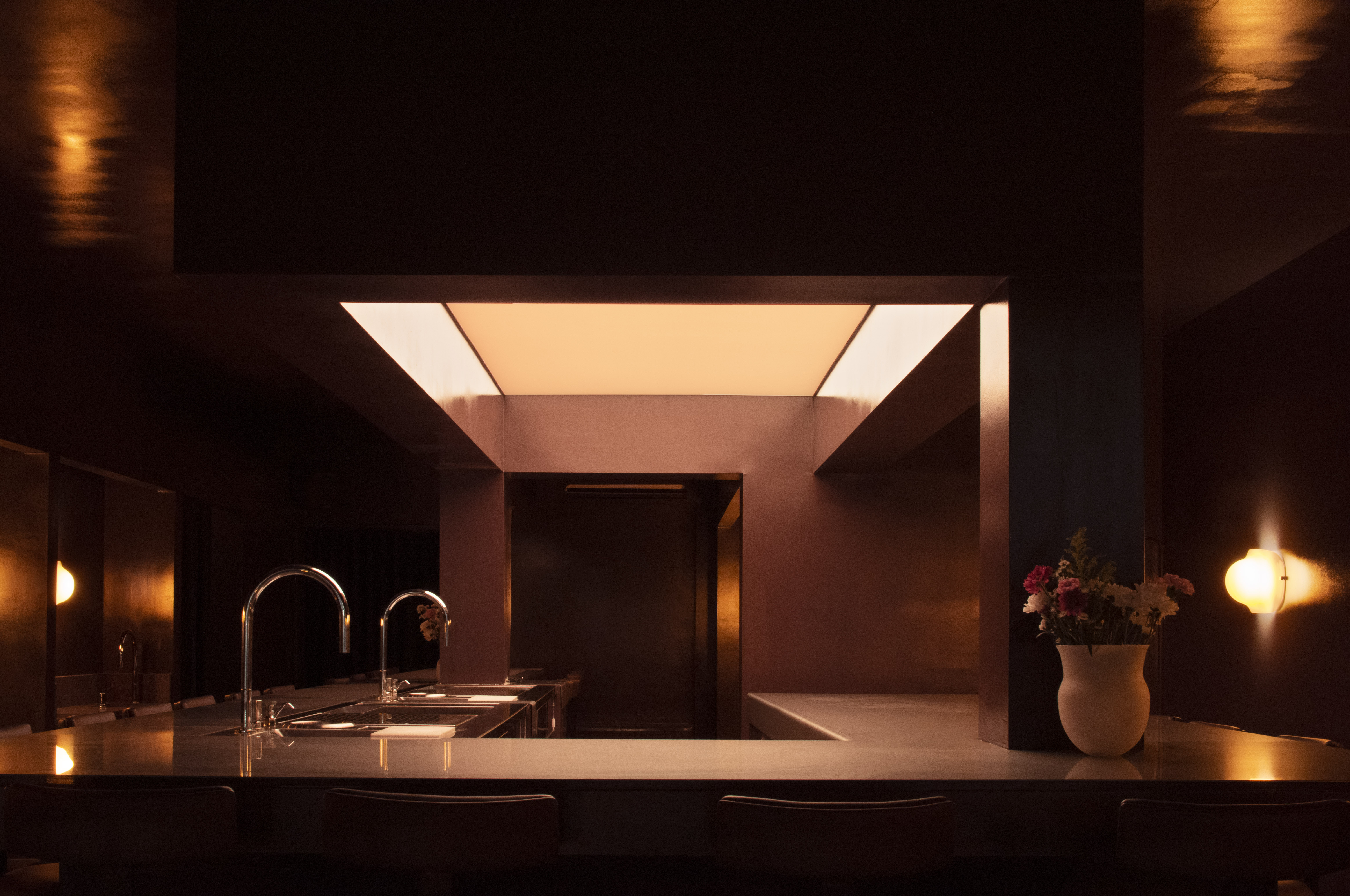A glossy brown envelope wraps the space — a bold, elegant hue that sets the tone for a moody, sensory experience. Suede banquettes, granite tables, 70s-inspired furniture, and stainless steel balance warmth with precision, while hand-blown glass fixtures by Verre d’Onge act as luminous sculptural accents.